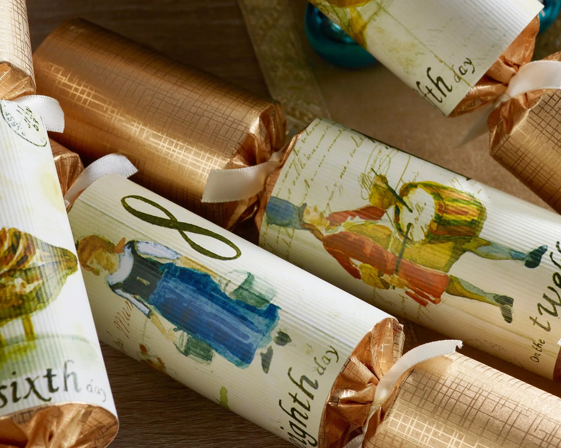 Denne elegante pakken inneholder 12 håndlagde smellbonbon, hver dekorert med motiver fra den engelske julesangen «The Twelve Days of Christmas». Fra partridges og drummers til swans og maids – hvert design forteller en del av sangen og gir en leken og luksuriøs stemning til julebordet. Perfekt som samtalestarter og dekorasjon i høytiden.