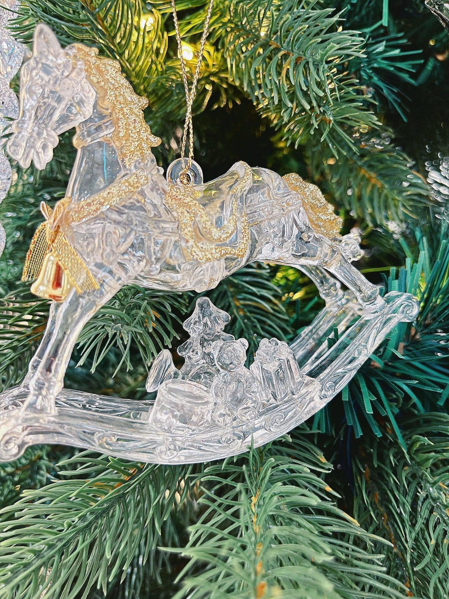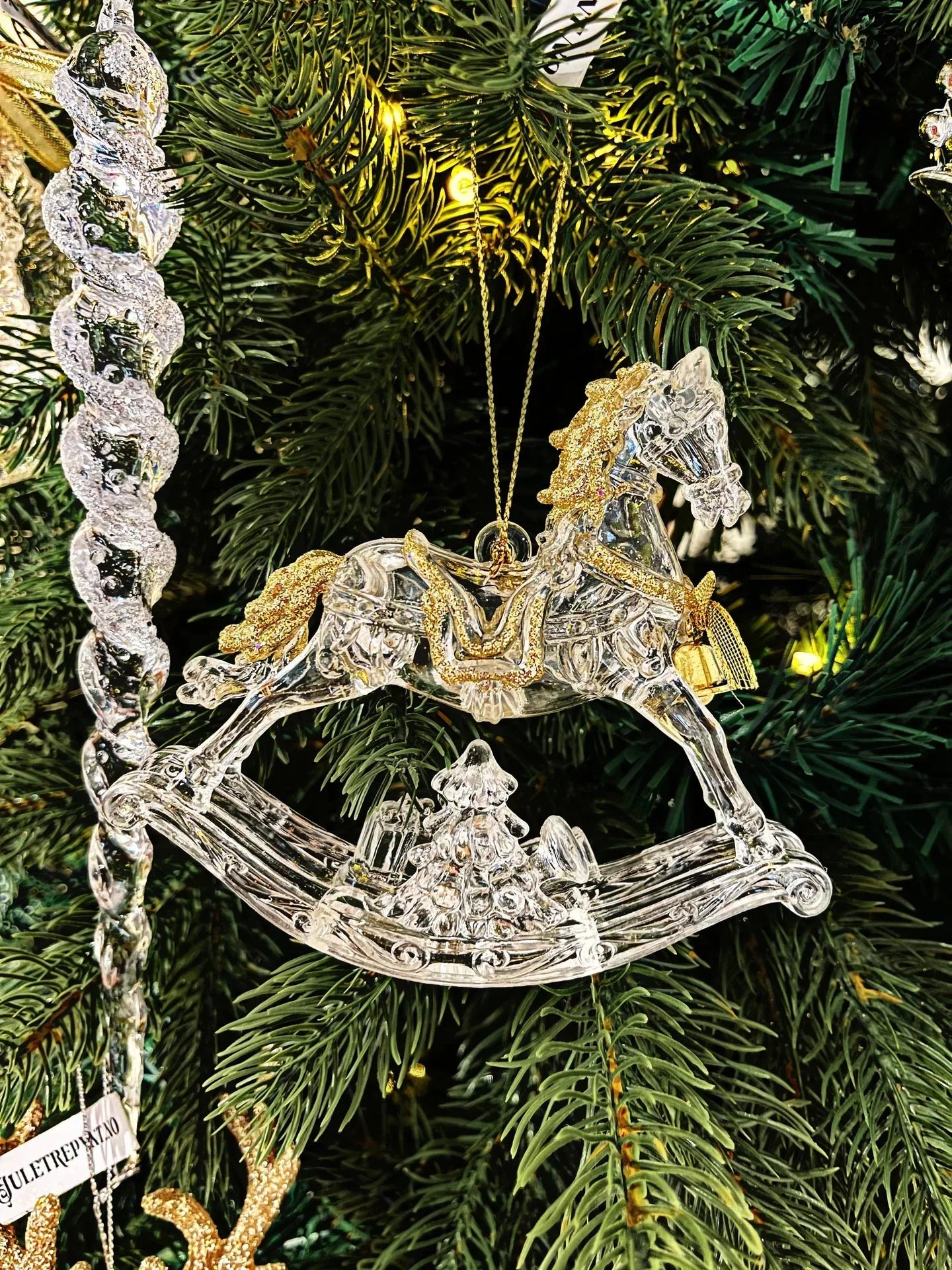 Elegant gyngehest i gjennomsiktig akryl med glitterdetaljer i gull. En flott gyngehest til ditt juletre.