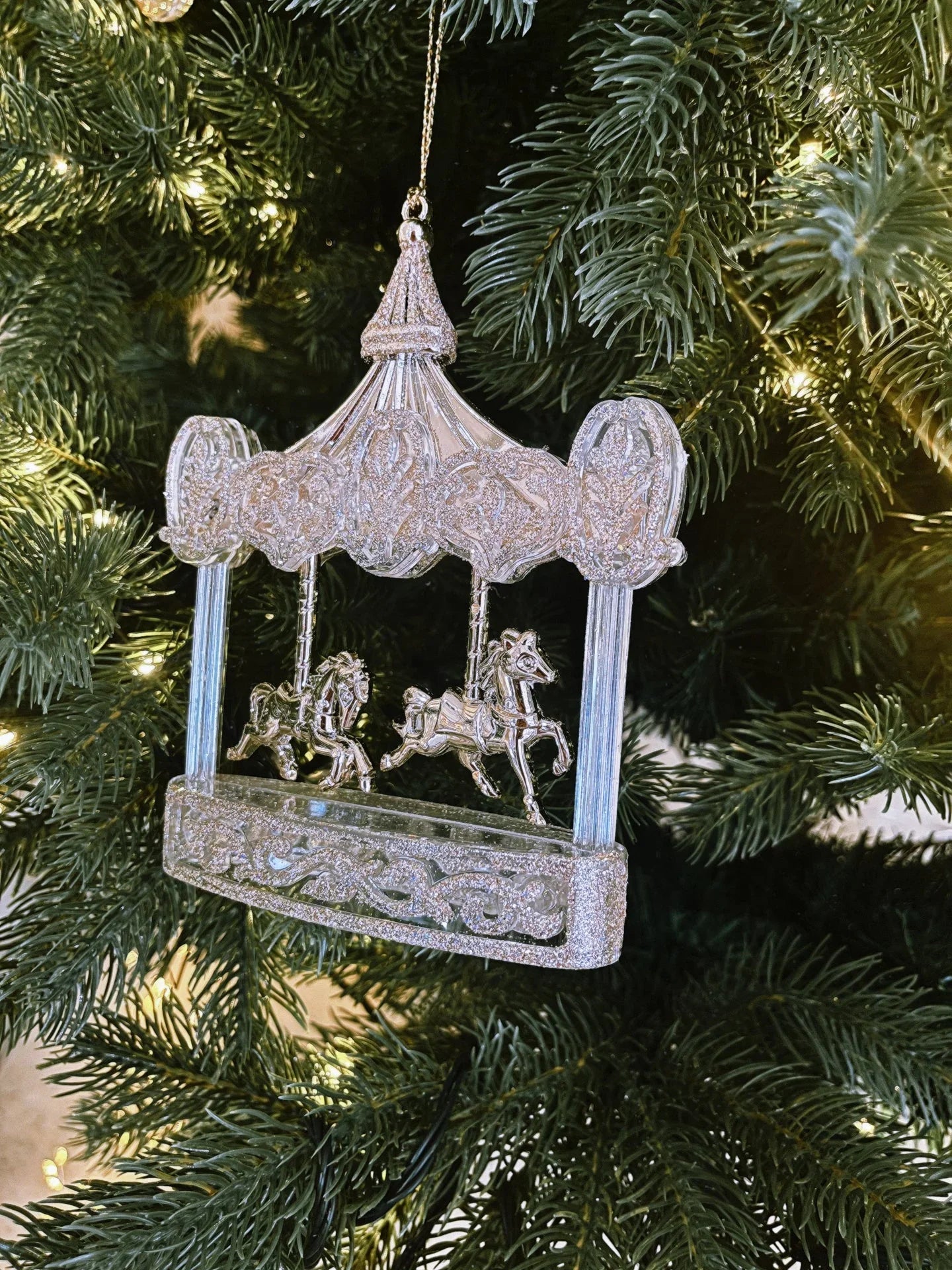 Rosegull akryl-karusell med glitterdetaljer. Elegant julepynt til ditt juletre. En flott juletrepynt i unik størrelse.