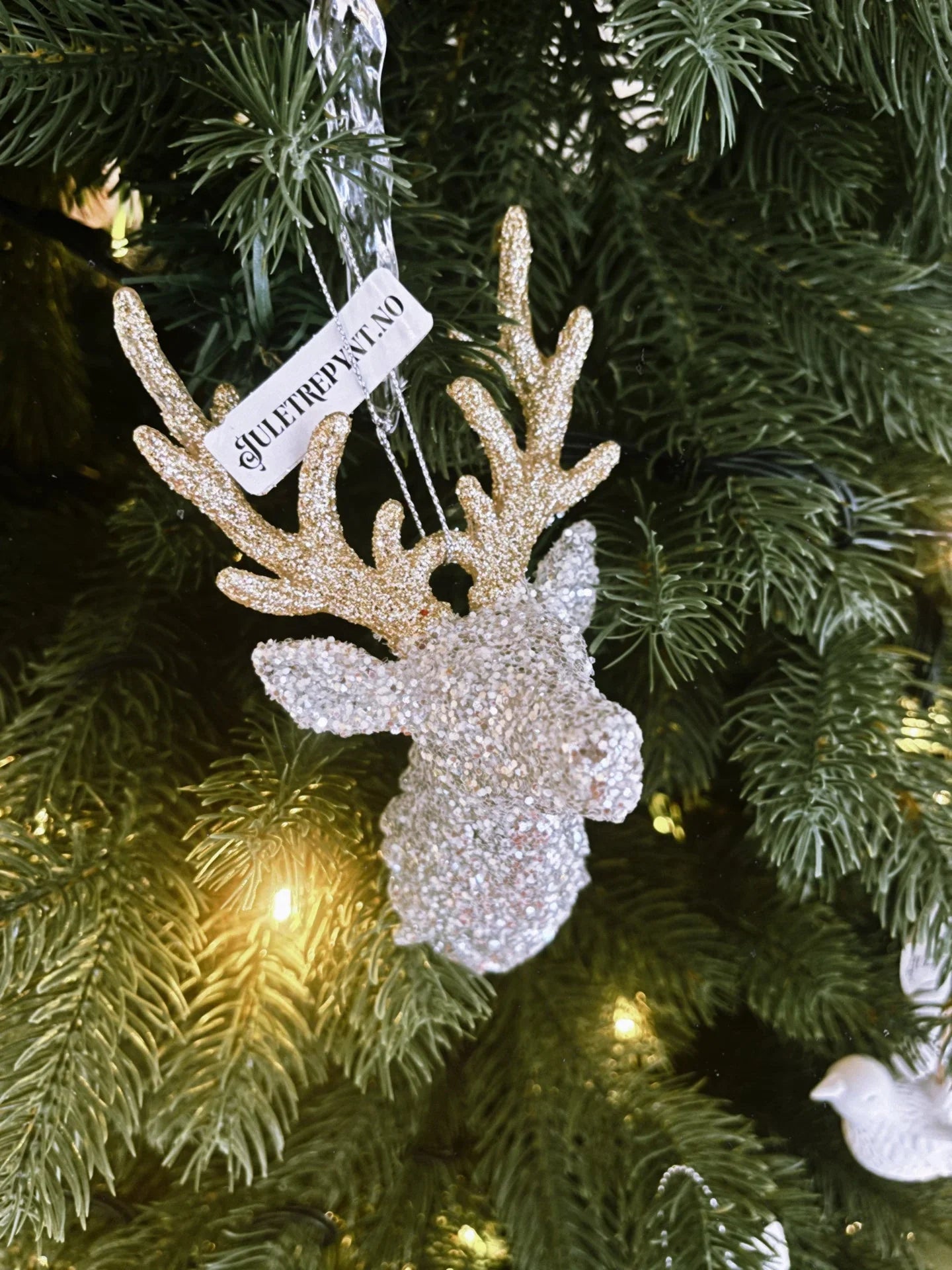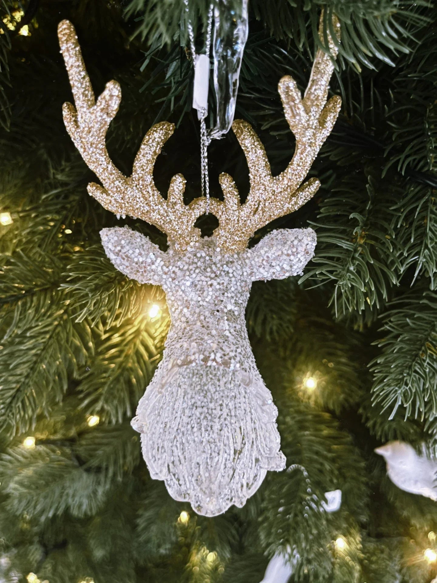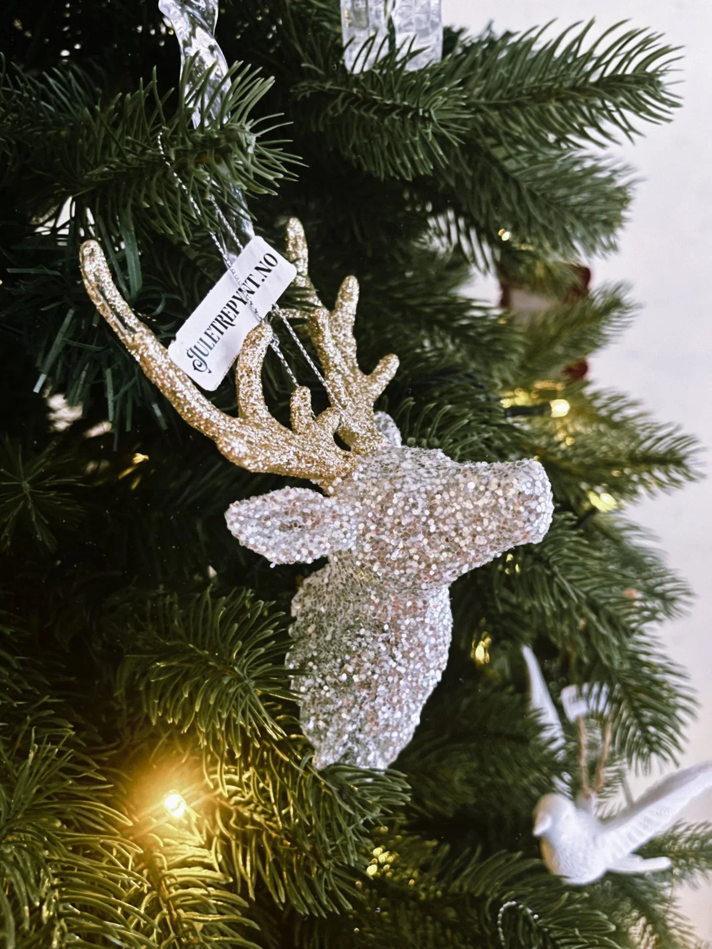 Reinsdyr juletrepynt i elegnat akryl. Pynten er dekket i glitter. Sølv på hodet og gull på gevir.
