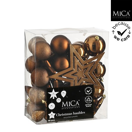 Sett med juletrepynt i brun - 40 deler med stjerne